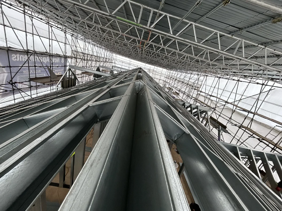 The steel joists forming the roof had to be cut at precise and often opposing angles on both ends, with each piece individually tailored to fit into the complex geometry of the build. Some joist studs spanned up to 6 metres in length and had to be manually lifted nearly 7 metres high—without the use of lifting equipment, relying only on a scaffold tower and the sheer effort and coordination of our site team.